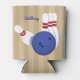 Crea el regalo personalizado perfecto para tu bolera favorita. Esta puede llevar una manga con un ilustracion de estilo realista de una bolera azul y boliche con fondo de rayas tostadas. Hay un punto en la parte delantera para agregar un nombre con letras de guiones azules. En el reverso hay un ilustracion de bolos que se coordina.