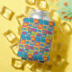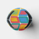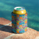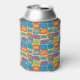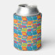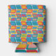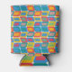 Este refrigerador de bebidas tiene un diseño moderno de mediados de siglo de colores brillantes que hacen rectángulos redondeados con otros rectángulos dentro formados por una colección de líneas.