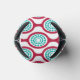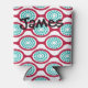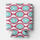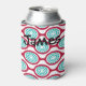 Este refrigerador de bebidas tiene un diseño moderno de mediados de siglo de ovales color remolacha conectados en cadenas con círculos concéntricos turquesa hechos de anillos de círculo dentro. ¿El mismo diseño, colores diferentes? Mándame un mensaje.