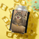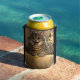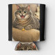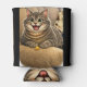 A can cooler featuring a caricature of a cat.