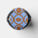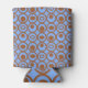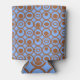 Este refrigerador de bebidas tiene un diseño geométrico de círculos en filas con círculos u óvalos dentro de marrón sobre un campo azul.