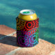 Este refrigerador de bebidas tiene un diseño de Historia Negra de grandes círculos formados de formas de gotas de lluvia y círculos en rojo, amarillo, púrpura, verde y turquesa.