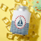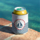 Diseño náutico con decoración de velero en forma redonda sobre fondo de rayas azules y blancas