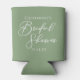 Esta sencilla funda para enfriar bebidas de ducha de novia de color verde menta presenta tipografía blanca elegante para una ceremonia al aire libre en un entorno natural. Letra minimalista en detalles de color verde claro para una boda rústica al aire libre cerca de un bosque de árboles.