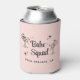 Recuerdos femeninos enfriadores de lata rosados para su fiesta de soltera con ilustraciones de chicas fiesteras tomando el sol en vasos de cóctel, estrellas de brillo retro, "Babe Squad" en una tipografía retro y la ubicación de su fiesta u otro texto en tipografía simple.