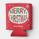 Feliz Navidad Moderna Navidad Festividad Roja Refrigeradores de bebidas Personalizados presentan una moderna Feliz Navidad en verde y rojo, con acentos de copos de nieve y personalizado con tu nombre a continuación. Personalice editando el texto en el cuadro de texto proporcionado. Diseñado por ©Evco Holidays www.zazzle.com/store/evcoholidays