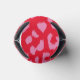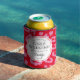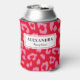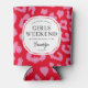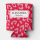 Celebra a la novia y sus últimos días de libertad con divertidos y coquetos enfriadores de latas personalizados que presentan un patrón de manchas de estampado de leopardo en rojo y rosa femenino y texto personalizado de nombre y título en el otro lado. La tipografía chic es fácil de personalizar con los detalles de tu evento y personalizar para cada invitado como un regalo de bienvenida o favor de fiesta.