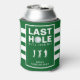 Celebre el último swing del novio antes del anillo con este enfriador de latas para la despedida de soltero con tema de golf con rayas verdes y blancas. El diseño presenta la frase "Último hoyo que golpeará", lo que lo convierte en una opción divertida y adecuada para una salida de golf o fin de semana de soltero. Perfecto para mantener las bebidas frías mientras se brinda por el novio, este enfriador de latas añade un toque divertido a la celebración. ¡Personalícelo con el nombre del novio y los detalles del evento para un recuerdo personalizado!