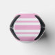 Cute pink and white stripped can cooler featuring a whimsical girl with long flowing yellow hair and wearing a green dress and stripped stockings. She is holding a beautiful bunch of red roses in her outstretched arms. The background is made up of a pink and purple love heart.