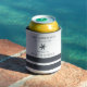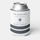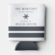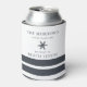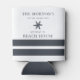 El Nautical refrigerador de bebidas presenta un diseño de rayas y estrellas de estilo costero. Personalice el texto del personalizado con un apellido familiar y una casa de playa (u otro título) con el año establecido y la ubicación. Color azul marino de hale y blanco.