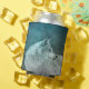 Refrigerador de bebidas con una fotografía de un bello lobo gris peludo y esponjoso. En el fondo hay un bosque oscuro con árboles. Vibra mística mágica.