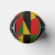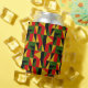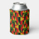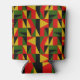 Este refrigerador de bebidas tiene un diseño de historia negra de triángulos y rectángulos en oro, rojo, verde y negro haciendo un patrón.