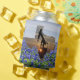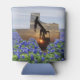 Toma de bomba de aceite al atardecer foto cortada en forma de impresión de Texas en lata koozie. El fondo es un campo de redes azules y un cielo azul. Personalice el nombre en la parte inferior o elimínelo con la herramienta de diseño fácil de usar.