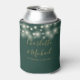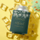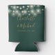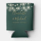 Un elegante enfriador de latas de regalo de boda en verde esmeralda y dorado que presenta hermosas luces de cadena, nombres de escritura de firma con estilo y fecha especial en tipografía moderna. Diseñado por Thisisnotme©