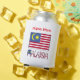 Refrigerador de bebidas personalizado muestra la bandera malaya roja, blanca, azul y amarilla con la palabra MALAYSIA abajo en los colores de la bandera. Arriba, un espacio para tu nombre para una apariencia única y personalizada O, agrega el nombre de otra persona para un regalo. Un gran obsequio de medias o un regalo de Hanukkah.