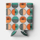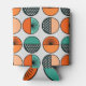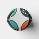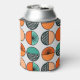 Este refrigerador de bebidas tiene un diseño moderno de mediados de siglo de medio círculo en verde azulado y naranja con medio estallido en algunos y pequeños círculos repetitivos en otros.