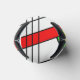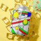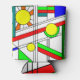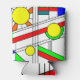 Este refrigerador de bebidas presenta un diseño moderno de mediados de siglo, con un aspecto de vidrio teñido con líneas negras y círculos llenos de colores primarios y secundarios.