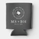 Los refrigeradores de bebidas impresos de personalizado a todo color hacen de la boda un divertido y funcional favor a sus invitados. Personalice la plantilla con los nombres de la novia y del novio o iniciales de monograma. Añada su fecha de boda, la ciudad, el estado o el nombre del lugar de celebración o cualquier otro texto personalizado. Este moderno diseño rústico estilo logo tiene un marco de guirnalda botánica con el mapa del estado de Texas en tonos blanco y gris carbón. Utilice las herramientas de diseño para elegir cualquier color de fondo, editar los tipos de letra o cargar sus propias fotos para crear un favor de boda completamente personalizado que coincida con sus colores y estilo boda!