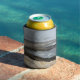 A foggy overcast day in Morro Bay California with the ocean waves hitting the rocks on the shore in this beach photograph souvenir. This seaside travel photo keepsake can cooler features black cursive script above the beach rocks and grey sky.