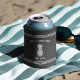 Estos geniales refrigeradores de bebidas personalizados incluyen el nombre de su familia en un fondo gris de carbón vegetal, con su año establecido y un ilustracion de piña. La raya de los árboles que se detalla en la parte superior e inferior completa el diseño de una casa de campo rústica.