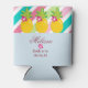 Novia para ser refrigerador de bebidas de las piñas es un koozie tropical para tu celebración nupcial. La mitad superior delantera tiene rayas diagonales rosas azules y verdes con tres piñas amarillas. El y la mitad inferior muestran el fondo azul. La información de la novia es de personalizable rosa con una flor rosa que separa su nombre de la fecha de su boda. ¡Haga su pedido hoy mismo!