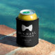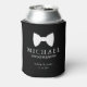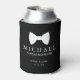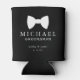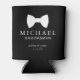 Enfriador de lata negro personalizable con ilustración de corbata de lazo blanca y tipografía clásica con el nombre de novias y novios y fecha. Este enfriador de lata será un recuerdo de boda perfecto para tu cortejo nupcial.