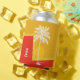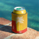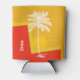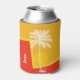 Elegante refrigerador de bebidas, con gráficos de una palmera sobre un fondo abstracto del amanecer naranja y amarillo. Personalice el texto personalizado por usted mismo o como una gran idea de regalo. Perfecto para la piscina este verano.