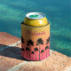 Un toque de glamour con efecto brillante sobre los koozies coloridos decorados con siluetas de palmeras, ideal para cualquier ocasión para el personalizar. Atardecer tropical en frente y cielo de medianoche al revés.