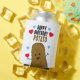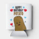 Patata marrón feliz divertida rodeada de corazones de amor rojos y azules con papa de cumpleaños feliz con letras negras y marrones encima de su cabeza.