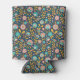 Este diseño de arte folclórico presenta un patrón floral rosa, naranja y verde azulado sobre un fondo azul oscuro.