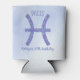 Este refrigerador de bebidas de la fiesta de cumpleaños de Pisces, de bonito morado y lavanda, presenta su signo astrológico del Zodiac en un brillo hermoso como las constelaciones. Personalizar esta bonita decoración con tu nombre en escritura cursiva para alguien con un cumpleaños de finales de febrero o principios de marzo.
