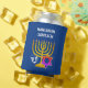 Elegante y elegante refrigerador de bebidas HANUKKAH de color azul medio, diseñado con una falsa menorah de oro, la colorida estrella de David y el dreidel blanco más la GREETING de PERSONALIZABLE - HANUKKAH SAMEACH, para que puedas crear tu propio saludo, por ejemplo. Feliz Chanukah. Ideal para la temporada de Hanukkah. Elija entre una amplia sección de prendas de vestir y regalos de Hanukkah, diseñados por los diseños bereanos.