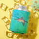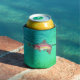 Refrigerador de bebidas de pesca de trucha arco iris saltando. La trucha arcoiris salta de una salpicadura de agua después de un señuelo de mosca. El fondo es un rizo de agua con un filtro de colores verde azul gradiente. Diseño de trucha arco iris dibujado a mano por ©Tina Hesskew de Fishing Hunting Life.