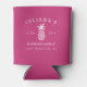 Haga su despedida de soltera, fin de semana de chicas o viaje con estos personalizados únicos refrigeradores de bebidas. El diseño personalizado en color rosa magenta vibrante presenta el nombre de la novia, el tipo de evento, el año y el destino que acompañan un ilustracion de silueta de piña blanca.