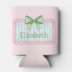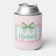 This cute can cooler features a pink frame with blue and white stripes and topped with a preppy green and white gingham plaid bow on each side. Personalize with your choice of name or special text on the front and back. Fun for personalized party favors and gift bags.