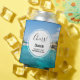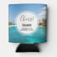 Cumpleaños u otros refrigeradores de bebidas de eventos con una hermosa foto que incluye un resort de playa tropical. agua azul bonito y playa de arena blanca con cabañas de paja que le confieren un ambiente tranquilo a la isla. Un círculo blanco se cubrió por encima con el texto dentro.