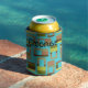 Este refrigerador de bebidas presenta un diseño moderno de mediados de siglo de rectángulos redondeados en tonos verdes y marrones, con agujeros en un campo de color turquesa. Si te gusta el diseño pero prefieres colores diferentes, envíame un mensaje.