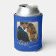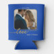 Elegante refrigerador de bebidas con sus fotos personalizados en el frente y en la parte posterior, enmarcado por un diseño azul y dorado con texto de escritura estilizado "love" (opcional). Hermoso como regalo boda, para usar en la recepción o para guardar. Y personalizable para cualquier otra ocasión.