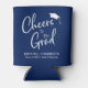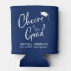 Un divertido refrigerador de bebidas azul marino para celebrar el graduado. "Saludos al Grado" está escrito en un moderno guión blanco con una tapa de grado encima y puedes personalizar su nombre, año de clase y escuela en tipografía blanca. Los colores se pueden personalizar según los colores de la escuela haciendo clic en "personalizar más adelante".