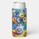 Beautiful can cooler with a beautiful impasto style ai illustration of blue and orange flowers in a fancy vase.