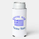 El diseño personalizado muestra la bandera de Grecia y las palabras DIOS GRIEGO arriba, en letras azules. Agregue un nombre debajo para personalizar su refrigerador de bebidas de seltzer o crear un regalo personalizado. Diversión para griego-americanos, canadienses griegos o cualquier persona con herencia, ascendencia o cultura griegas. ¡YIASSOU! La bandera es azul y blanca con una cruz azul sobre un fondo blanco en la parte superior izquierda.
