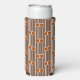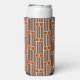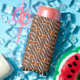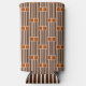 Este refrigerador de bebidas seltzer tiene un diseño geométrico de cinco líneas con dos cajas encima repetidas sobre el diseño.