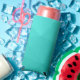 Fiesta de verano con un estilo único y moderno con latas geométricas o refrigeradores de botellas. Malla geométrica del Triángulo Verde Turquesa verde azulado de agua azul con diseño de gradiente oscuro a luz.