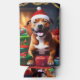 Esta imagen resalta el espíritu navideño con el Staffy en un sombrero de Papá Noel, rodeado de regalos y decoraciones navideñas, listos para difundir algunas ovaciones "aplacadoras".