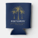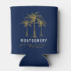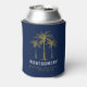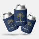 Customize this tropical navy blue and gold can cooler with your own special touch. This elegant design features your family name and reunion date under three artistic golden palm trees.