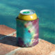 Un Refrigerador de bebidas de espuma con una imagen de un diseño de tinte = ( Tye Dye # 1) = ( At by P.J.M.) en la parte delantera,( Revertido) en la parte posterior y por todas partes. Color= Turquesa,Amarillo, Rojo Púrpura Oscuro,