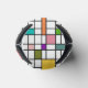 Este refrigerador de bebidas tiene un diseño moderno de mediados de siglo de una cuadrícula de líneas negras con cuadrados y rectángulos de colores retro en un campo de blanco.