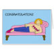 Un simple ilustracion, una mujer tendida en una tumbona con jeans y zapatos rosados y dos arcos rosados cubriendo su pecho. La imagen tiene un fondo azul pastel y se acompaña con la palabra "Felicitaciones".