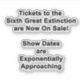 Un PEGATINA con las palabras "¡Las entradas a la Sexta Gran Extinción están ahora en venta! Mostrar las fechas se acercan exponencialmente" impreso en letras negras en la parte delantera. Esto es para promover la conciencia sobre el efecto perjudicial que el cambio climático tiene en todos los seres vivos.