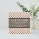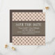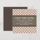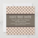 Fancy Lattice de moda y moda Salven los anuncios de fecha con un círculo elegante y un patrón de rombo sobre un vibrante fondo de melocotón con un amplio borde marrón de dos tonos. Esta elegante invitación a guardar la fecha es perfecta para anunciar a su boda moderno. Fácil de personalizar, simplemente agregue los detalles de su boda en los campos de texto proporcionados. Haga clic en "Personalizar" para encontrar más opciones de personalización.